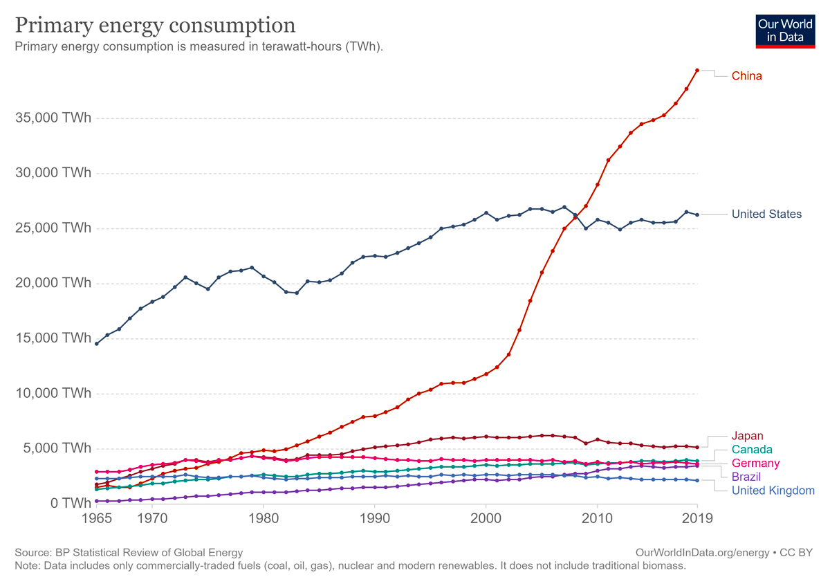 The US has been breaking records in production, but how do we compare to the rest of the world for consumption per person? Let’s look at the data. It is worth noting that population has steadily increased over this time frame, while you can see a leveling and decline in productions. Similar trends reflecting efficiency improvements can be seen in most developed nations.